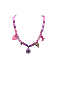 Fun necklace hand made with 6mm pink & purple opals + five charms.